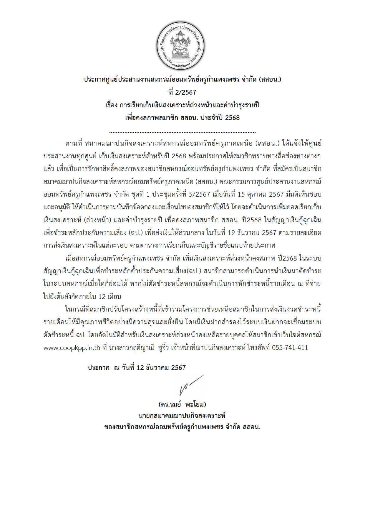 ประกาศ การเรียกเก็บเงินสงเคราะห์ล่วงหน้าและค่าบำรุงรายปี ประจำปี 2568 (สสอน.)