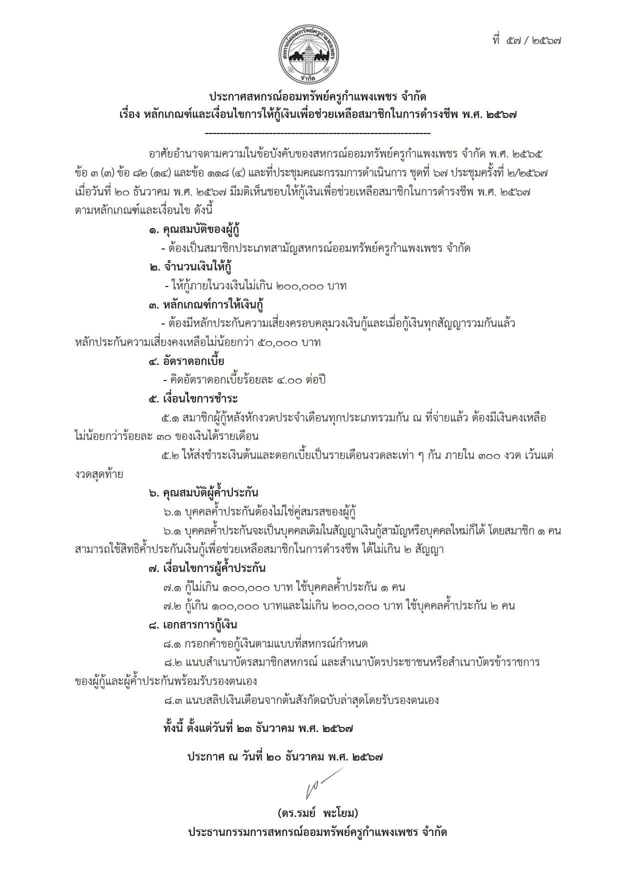 ประกาศ หลักเกณฑ์และเงื่อนไขการให้กู้เงินเพื่อช่วยเหลือสมาชิกในการดำรงชีพ พ.ศ. 2567