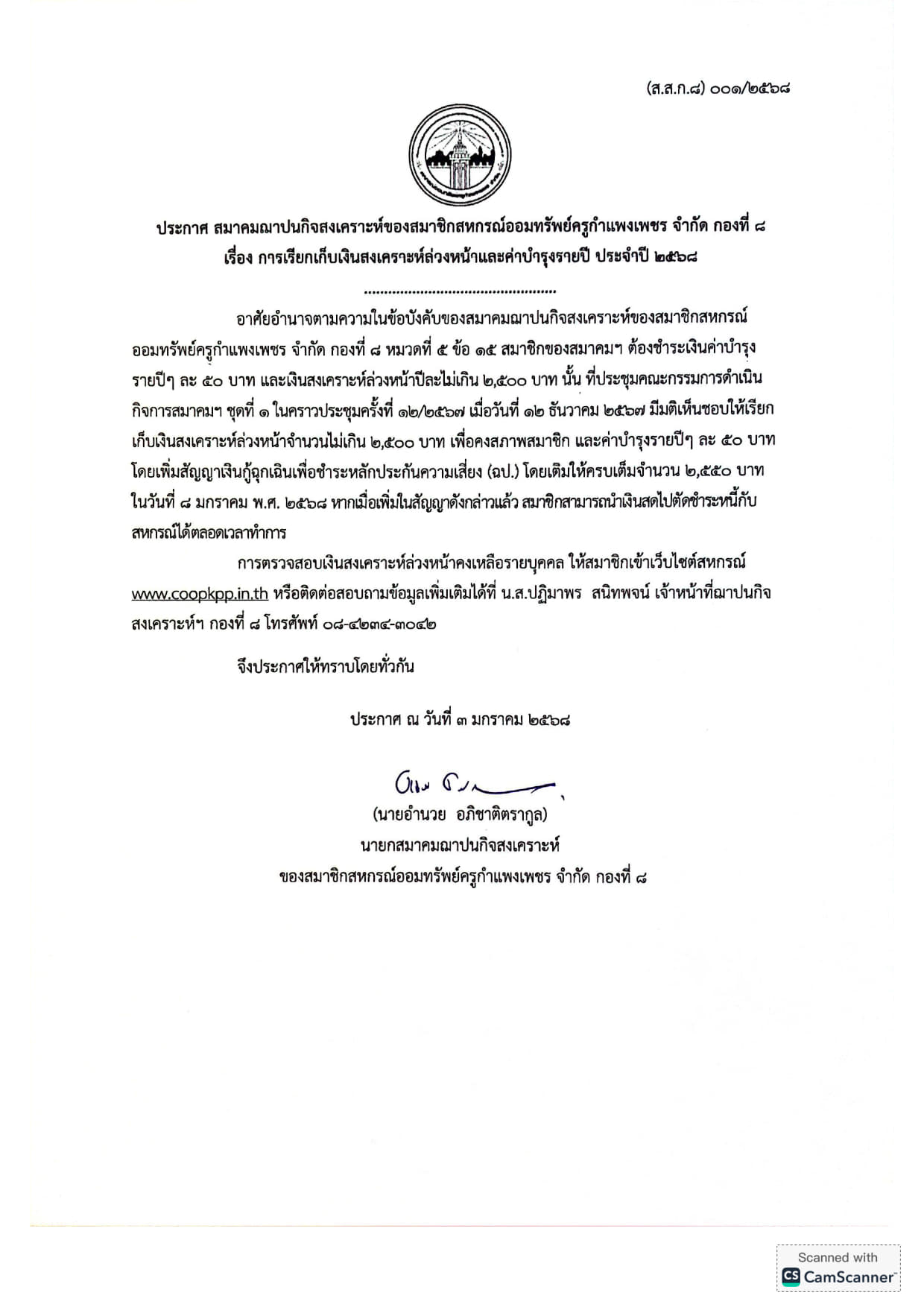 ประกาศ การเรียกเก็บเงินสงเคราะห์ล่วงหน้าและค่าบำรุงรายปี ประจำปี 2568 (ส.ส.ก.8)