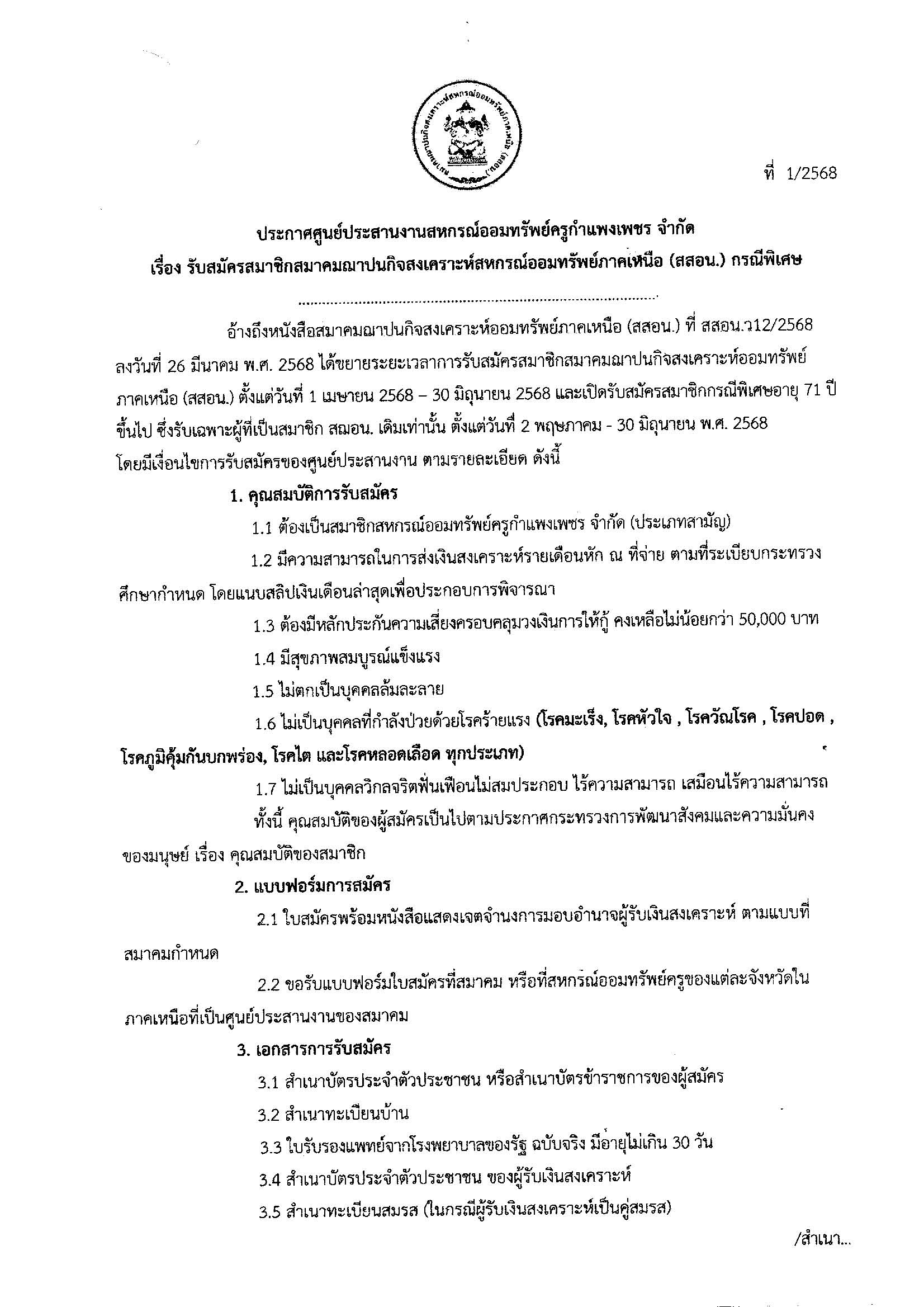 ประกาศ รับสมัครสมาชิกสมาคมฌาปนกิจสงเคราะห์สหกรณ์ออมทรัพย์ภาคเหนือ (สสอน.) กรณีพิเศษ