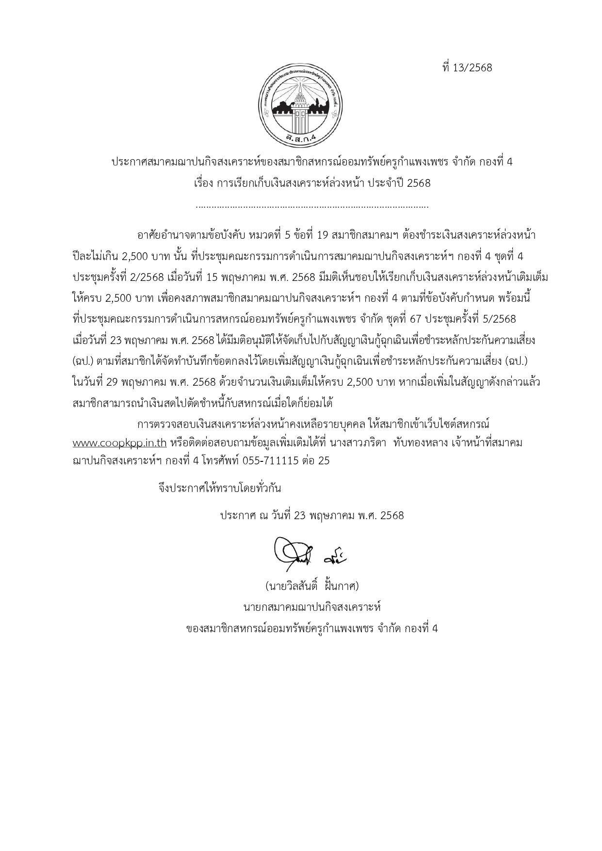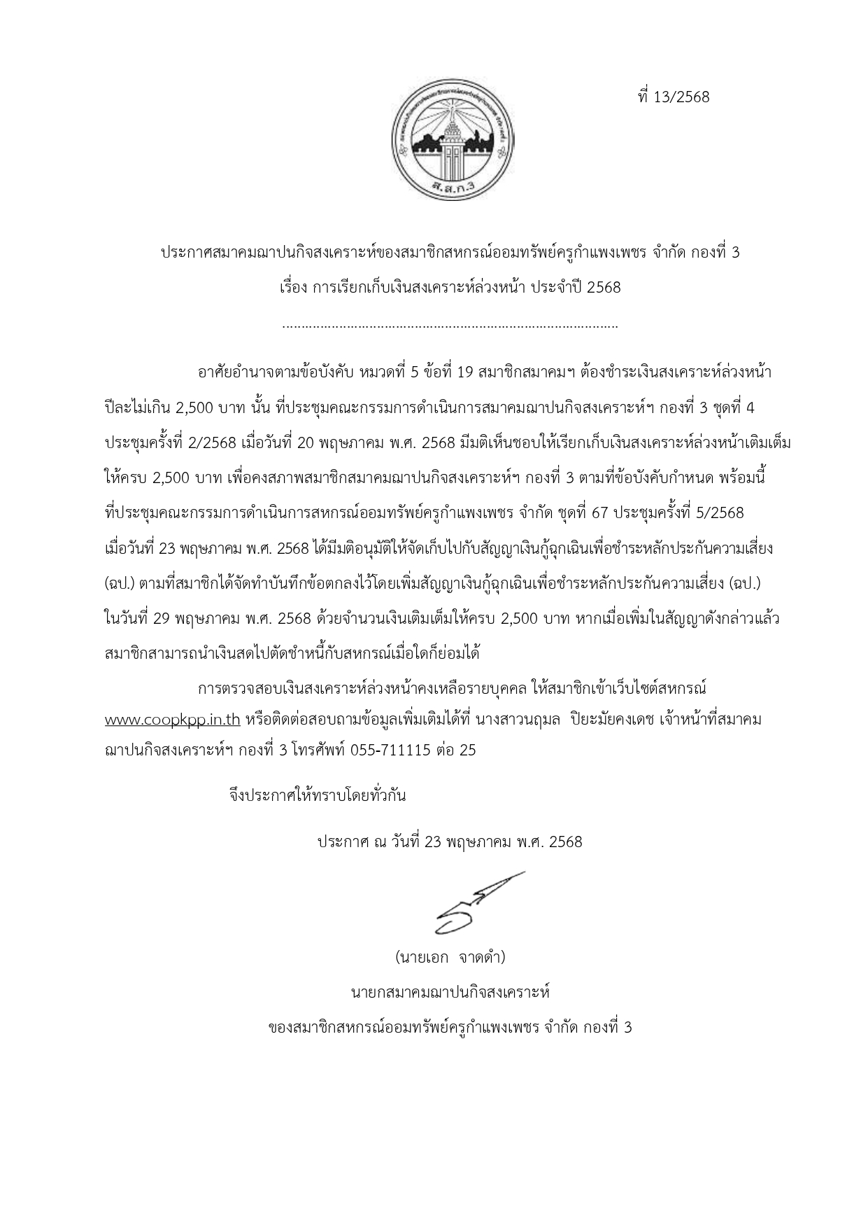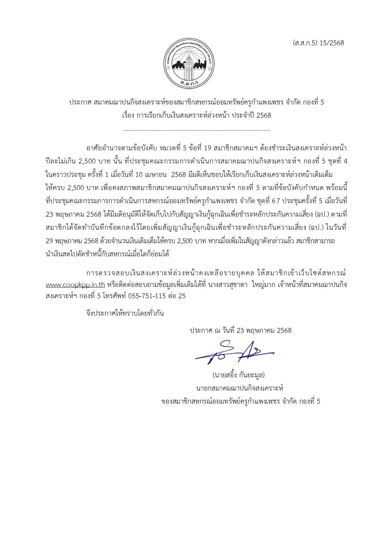 ประกาศ การเรียกเก็บเงินสงเคราะห์ล่วงหน้า ประจำปี 2568 (ส.ส.ก. 3-5)