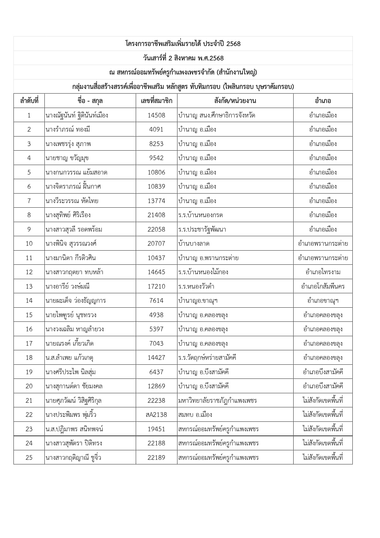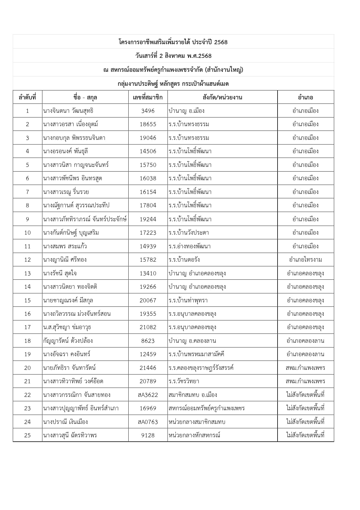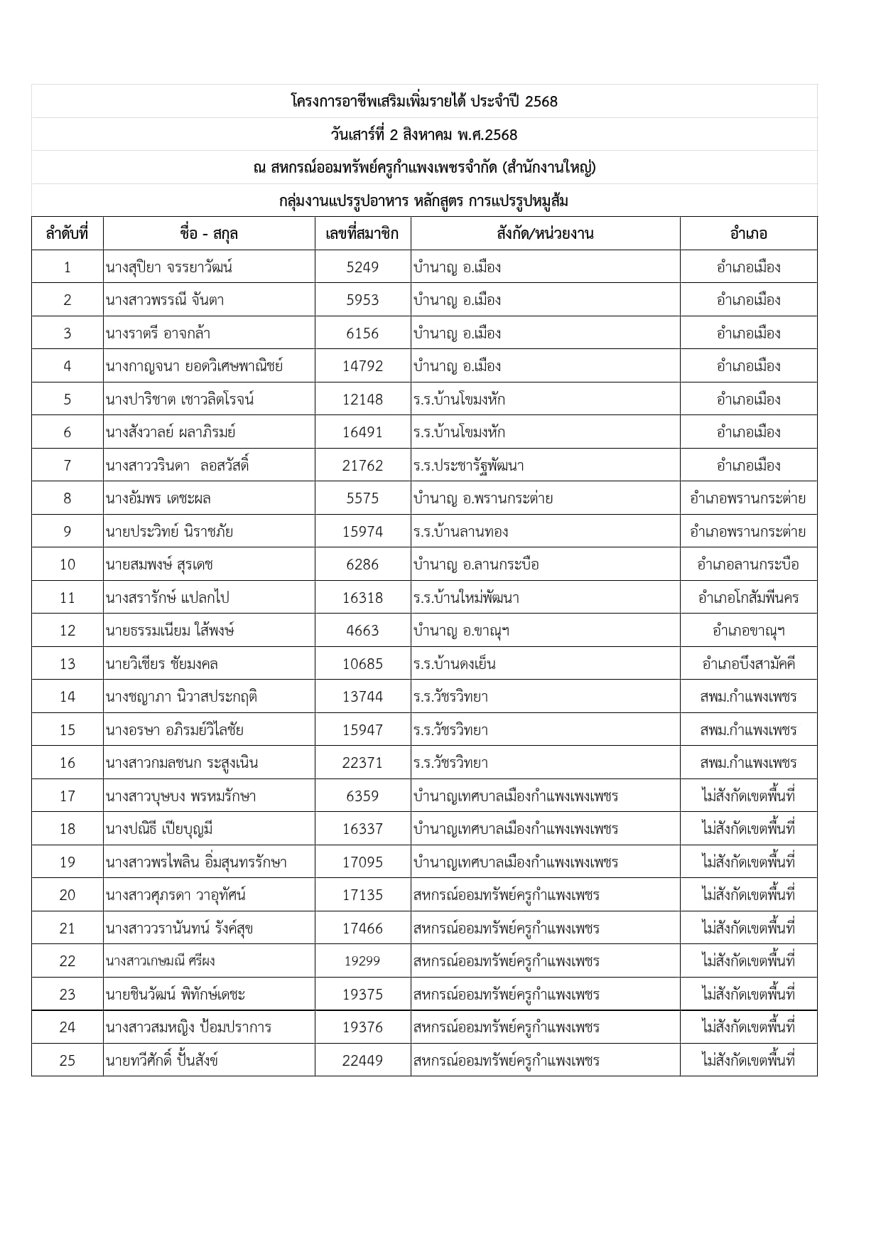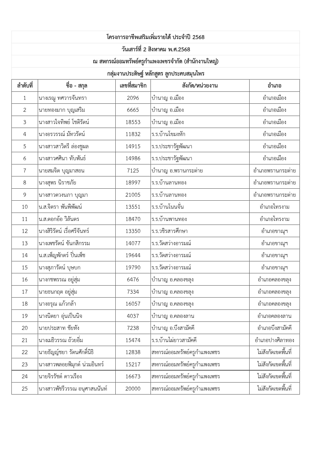 ประกาศ รายชื่อผู้เข้าร่วมโครงการอาชีพเสริมเพิ่มรายได้ ประจำปี 2568