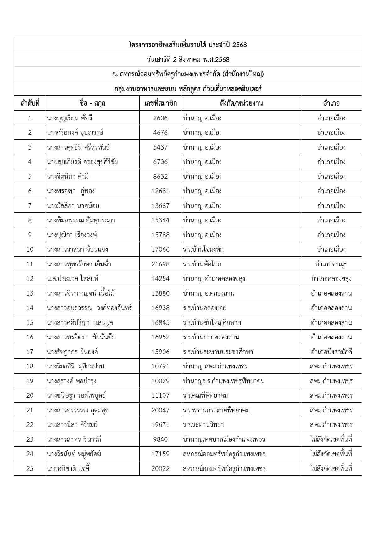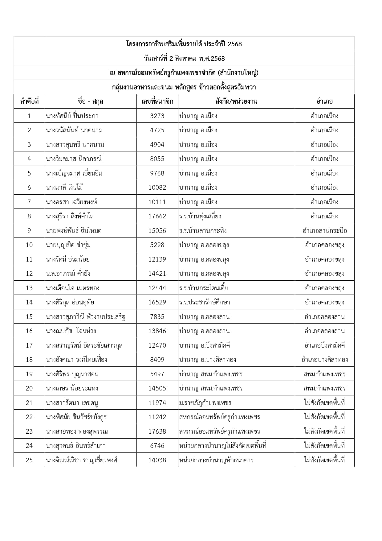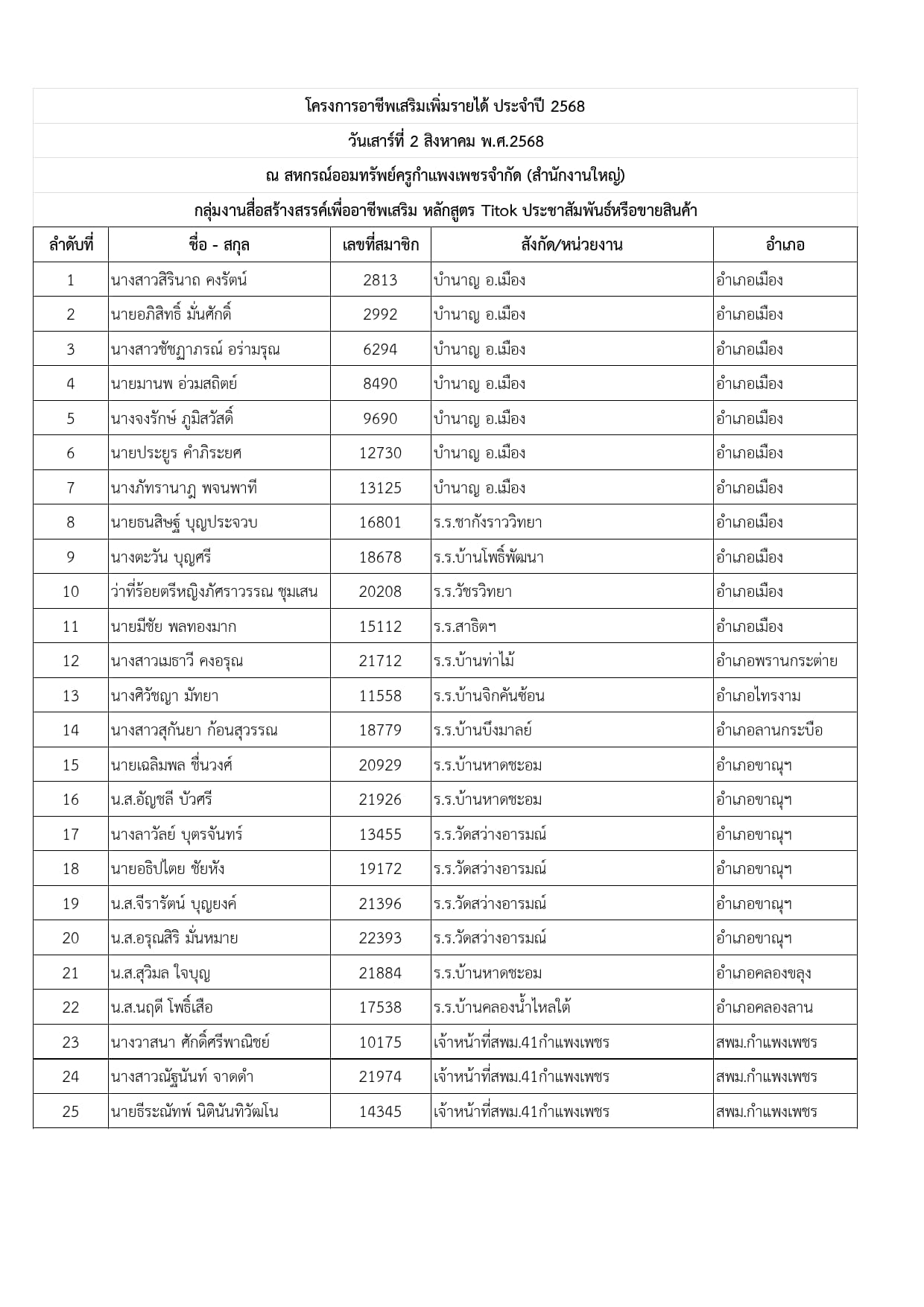 ประกาศ รายชื่อผู้เข้าร่วมโครงการอาชีพเสริมเพิ่มรายได้ ประจำปี 2568