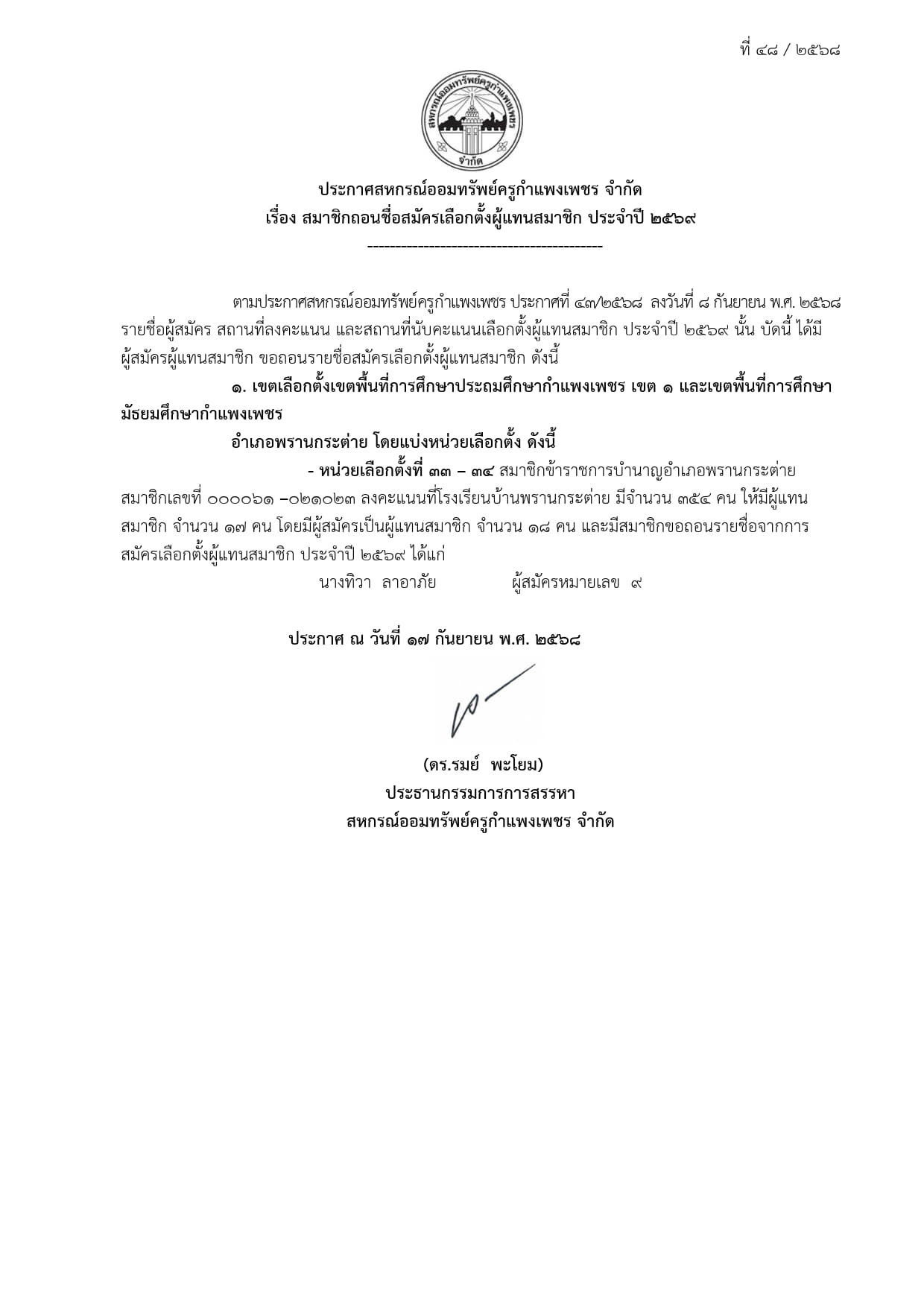 ประกาศ สมาชิกถอนชื่อสมัครเลือกตั้งผู้แทนสมาชิกประจำปี 2569