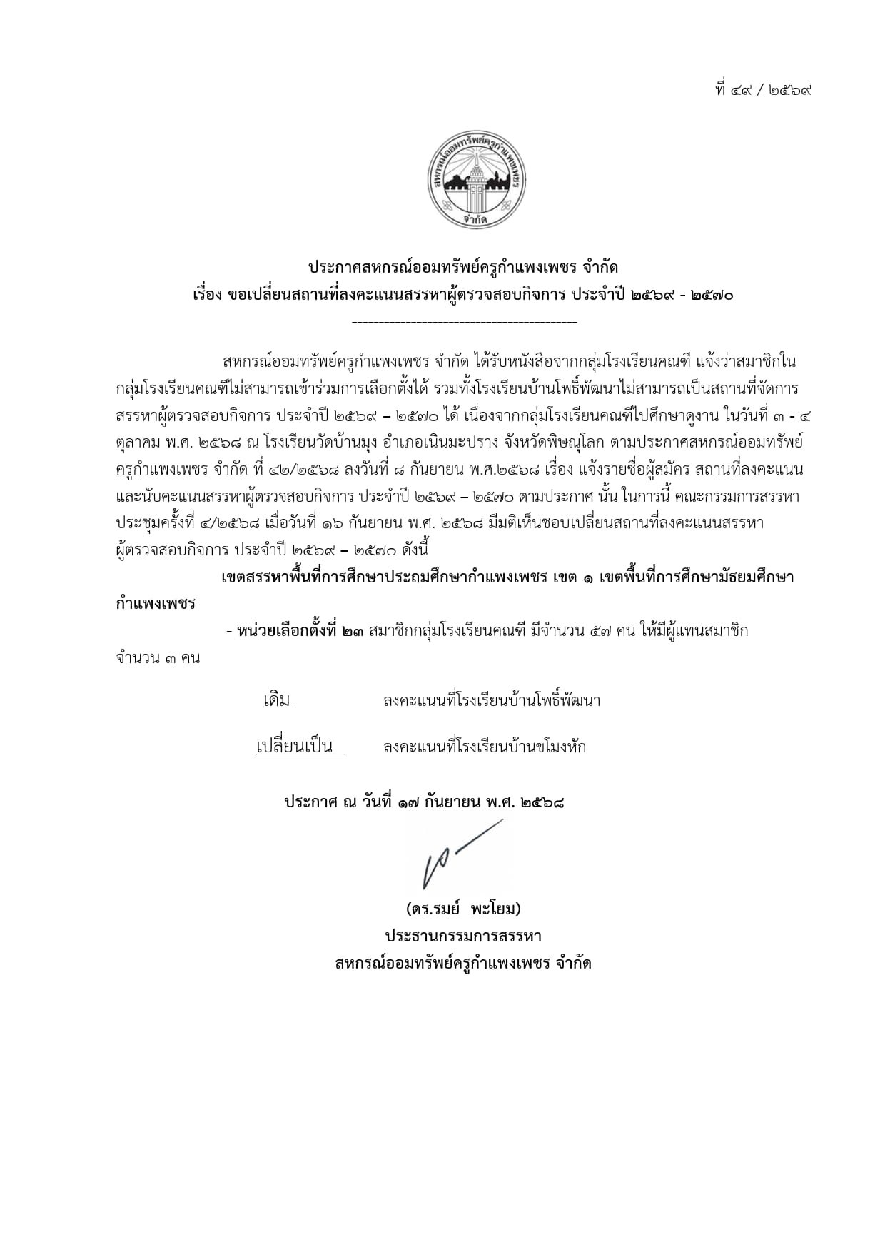ประกาศ ขอเปลี่ยนสถานที่ลงคะแนนสรรหาผู้ตรวจสอบกิจการ ประจำปี 2569 - 2570