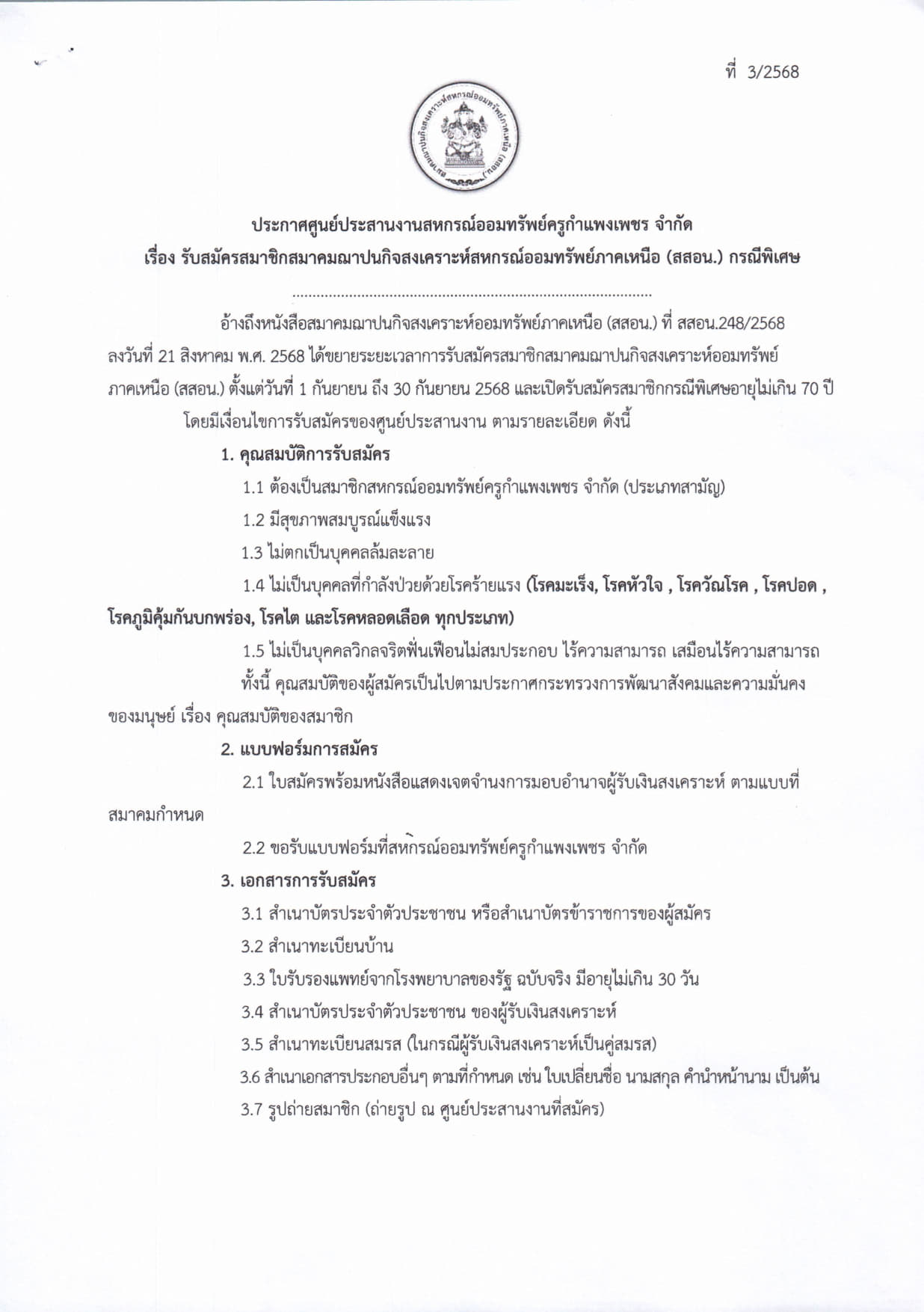 ประกาศ รับสมัครสมาชิกสมาคมฌาปนกิจสงเคราะห์สหกรณ์ออมทรัพย์ภาคเหนือ (สสอน.) รอบพิเศษ