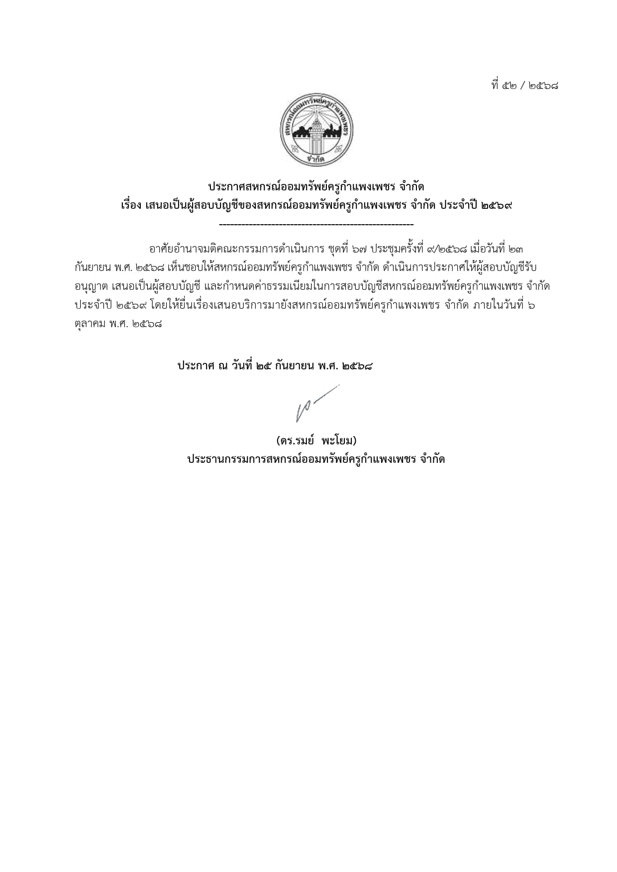 ประกาศ เสนอเป็นผู้สอบบัญชีของสหกรณ์ออมทรัพย์ครูกำแพงเพชร จำกัด ประจำปี 2569