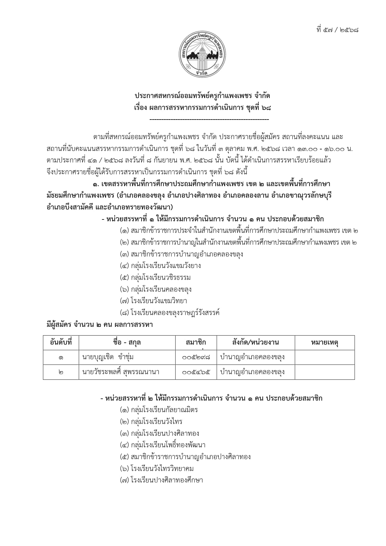 ประกาศ ผลการสรรหากรรมการดำเนินการ ชุดที่ 68