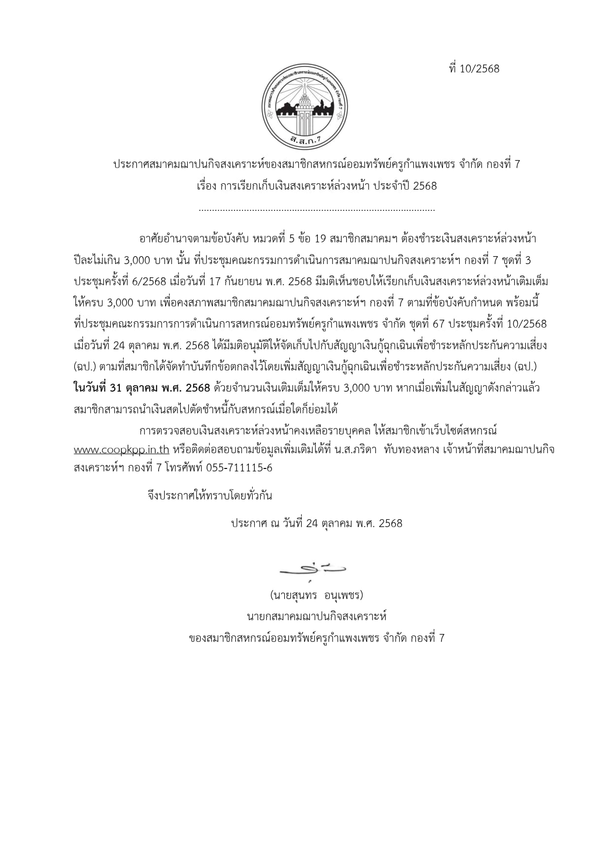 ประกาศ การเรียกเก็บเงินสงเคราะห์ล่วงหน้า ประจำปี 2568 ส.ส.ก.7