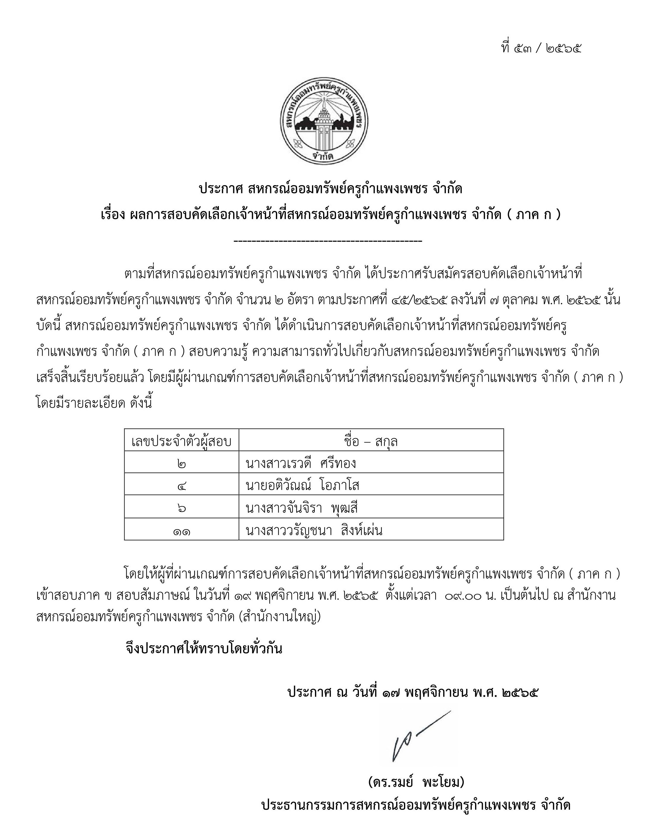 ผลการสอบคัดเลือกเจ้าหน้าที่สหกรณ์ ( ภาค ก )
