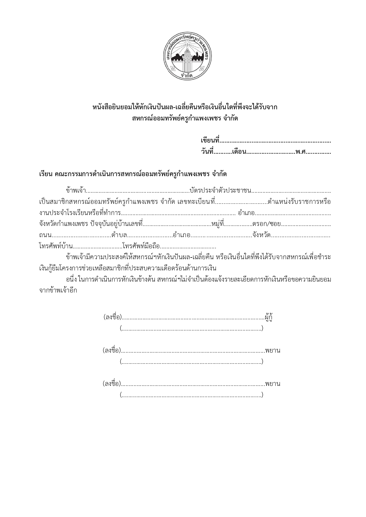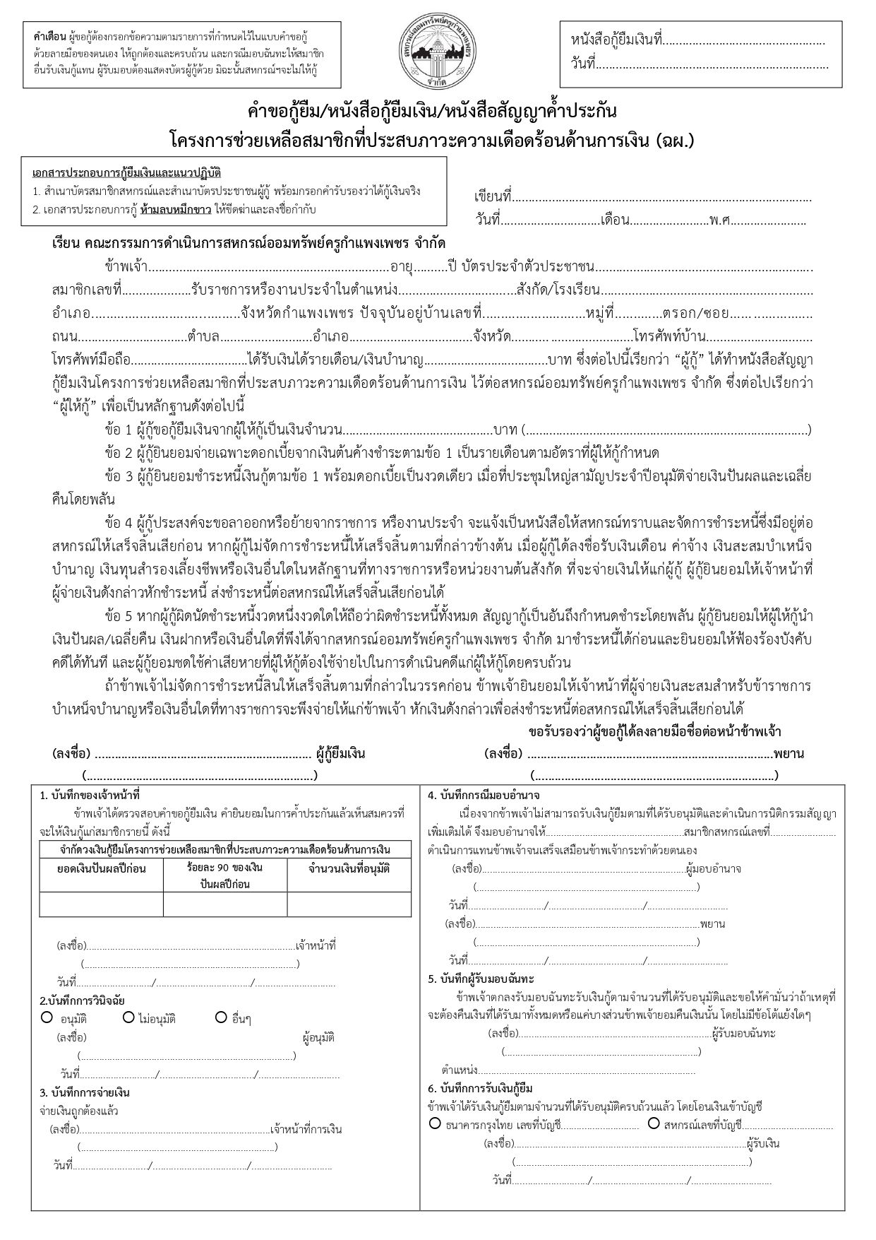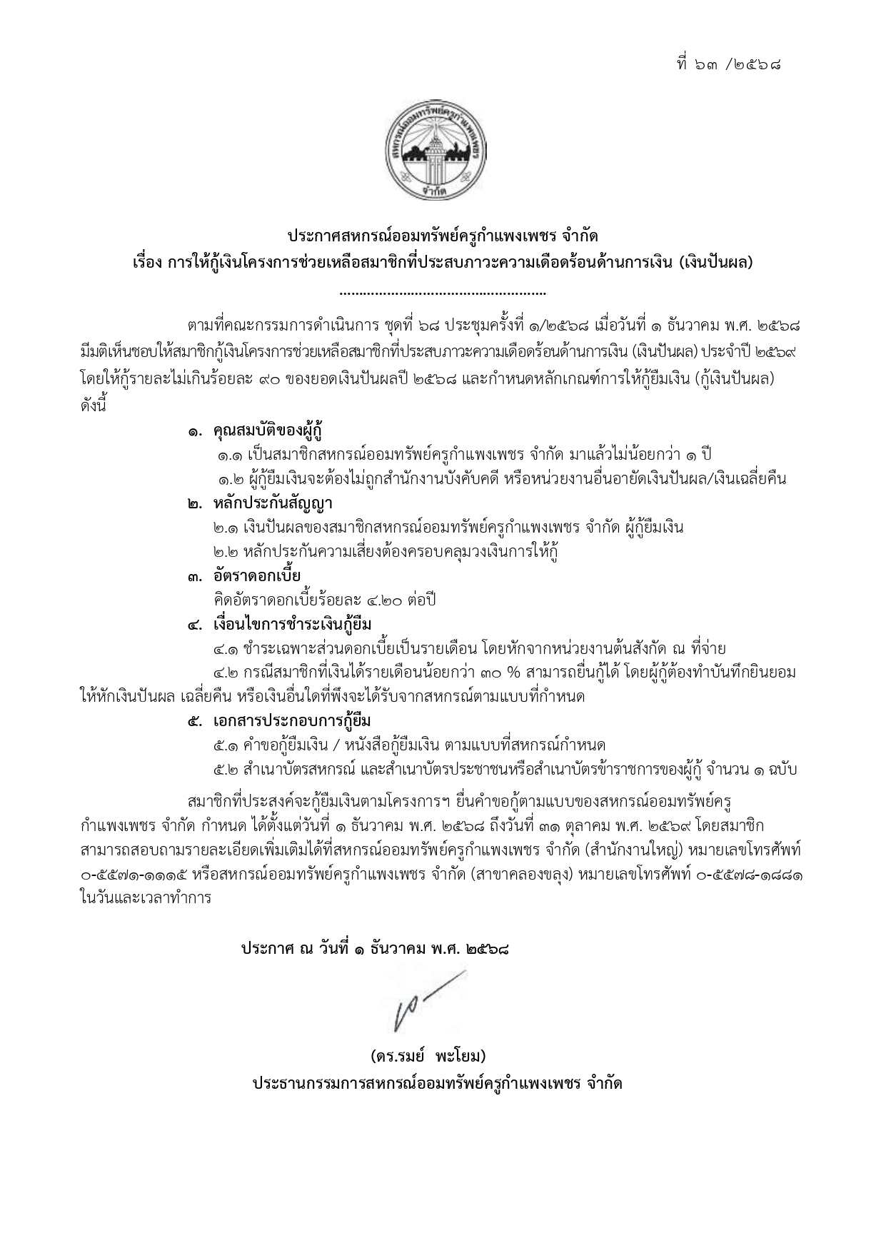 ประกาศ การให้กู้เงินโครงการช่วยเหลือสมาชิกที่ประสบภาวะความเดือดร้อนด้านการเงิน(เงินปันผล)