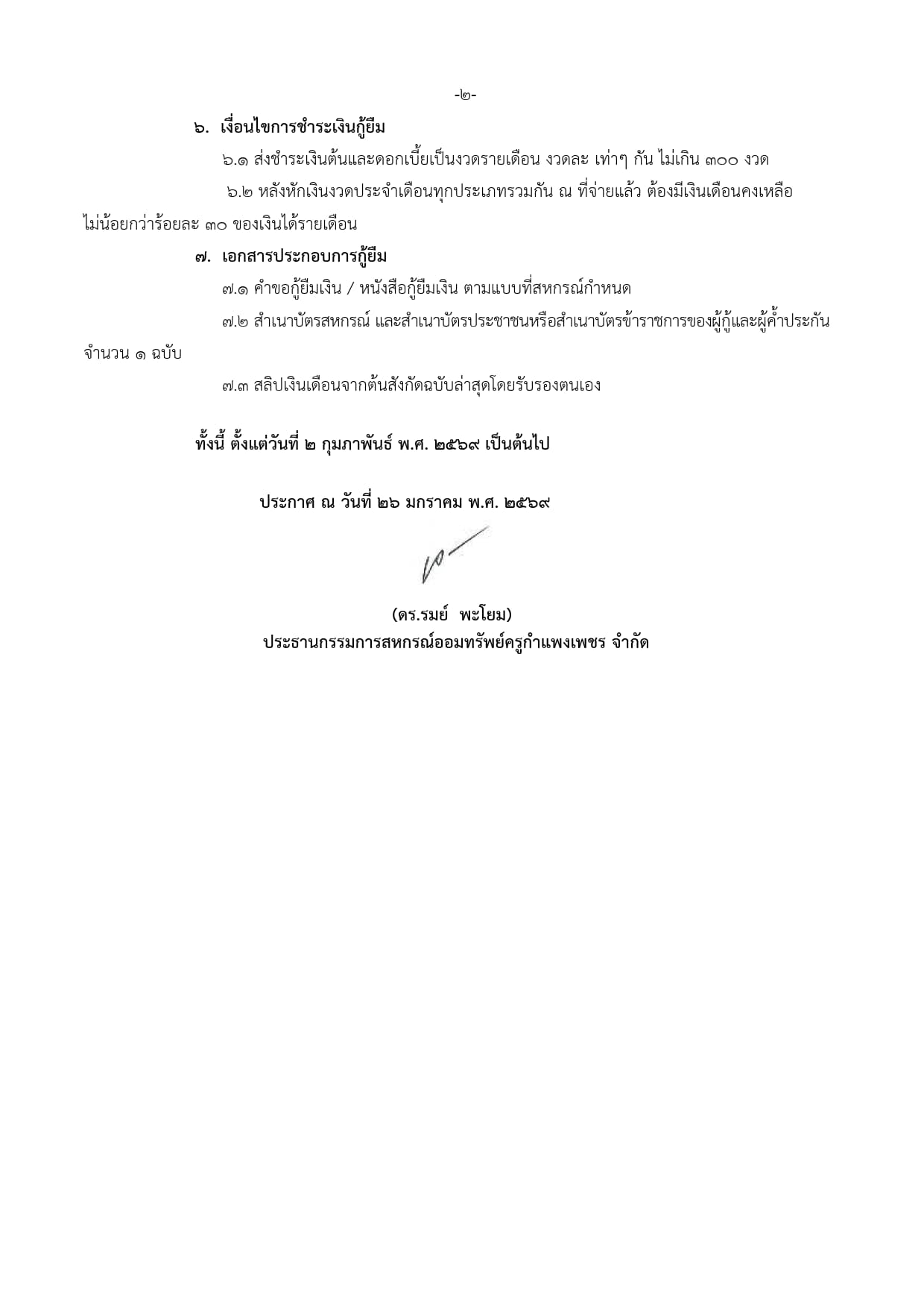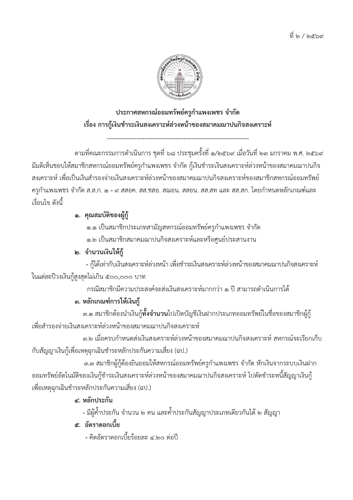 ประกาศ การกู้เงินชำระเงินสงเคราะห์ล่วงหน้าของสมาคมฌาปนกิจสงเคราะห์