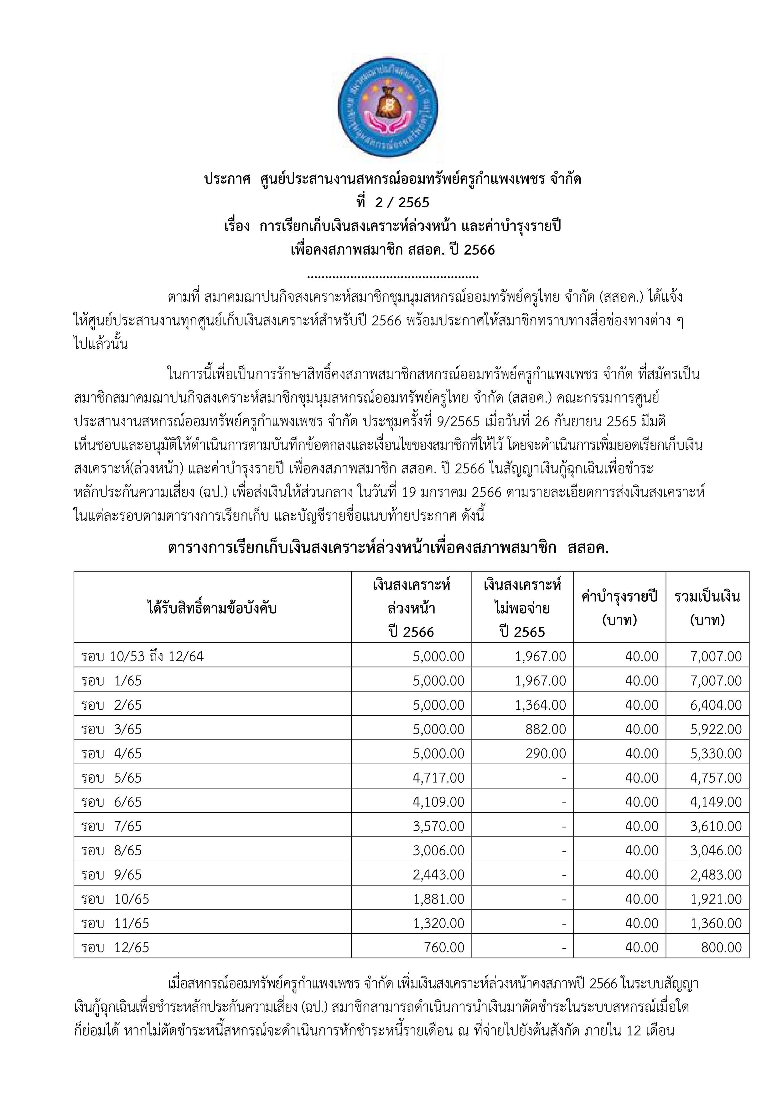 เก็บเงินสงเคราะห์ล่วงหน้า และค่าบํารุงรายปี สสอค. ปี 2566