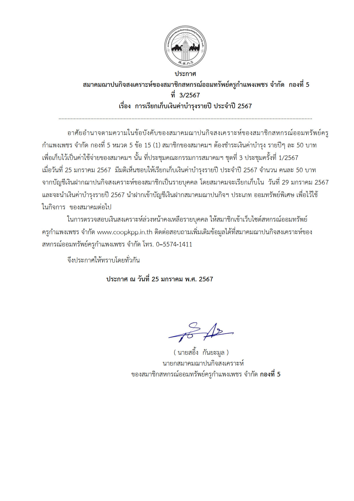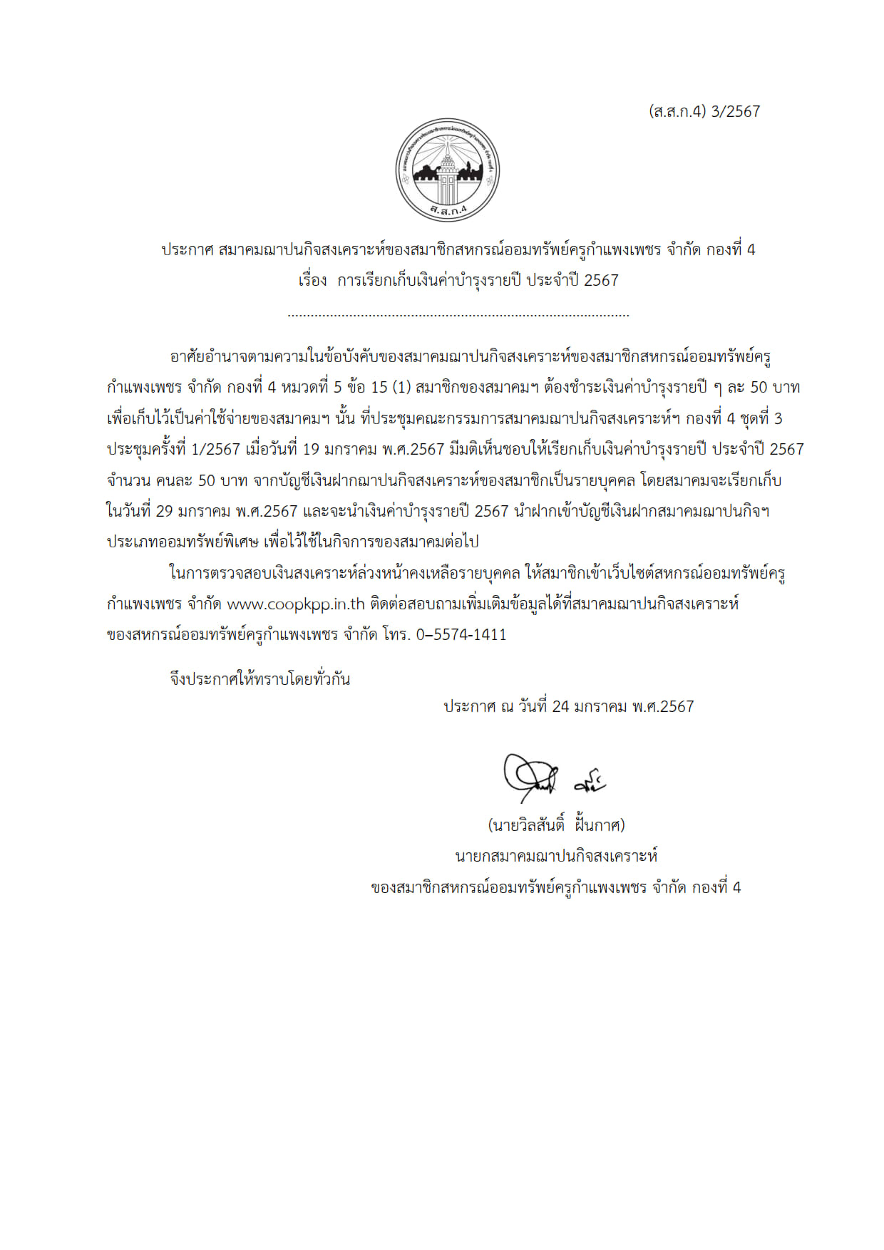 ประกาศ การเรียกเก็บเงินค่าบำรุงรายปี ส.ส.ก 3-7 ประจำปี 2567