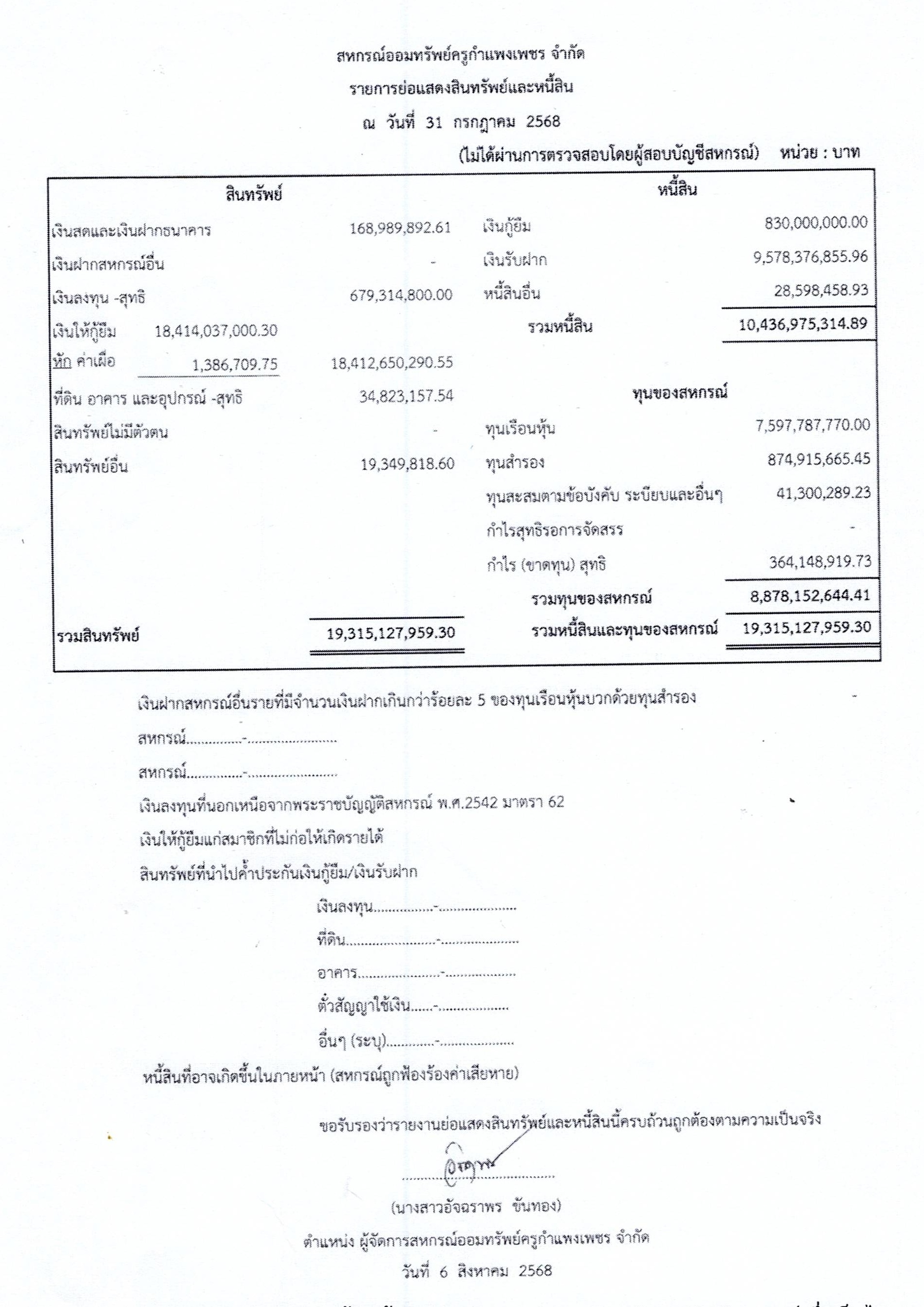 รายการย่อแสดงสินทรัพย์และหนี้สิน ณ วันที่ 31 กรกฎาคม 2568