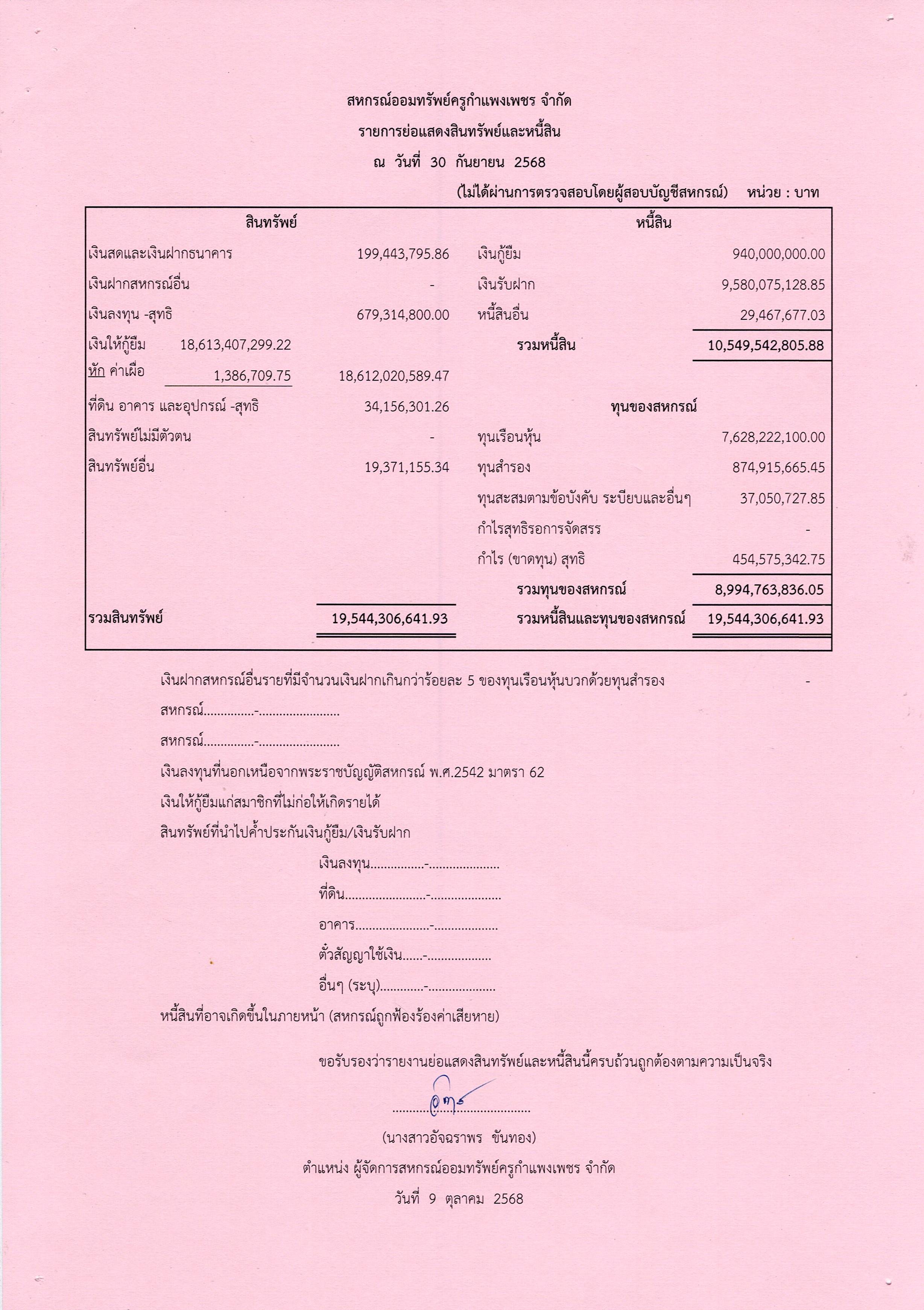 รายการย่อแสดงสินทรัพย์และหนี้สิน ณ วันที่ 30 กันยายน 2568