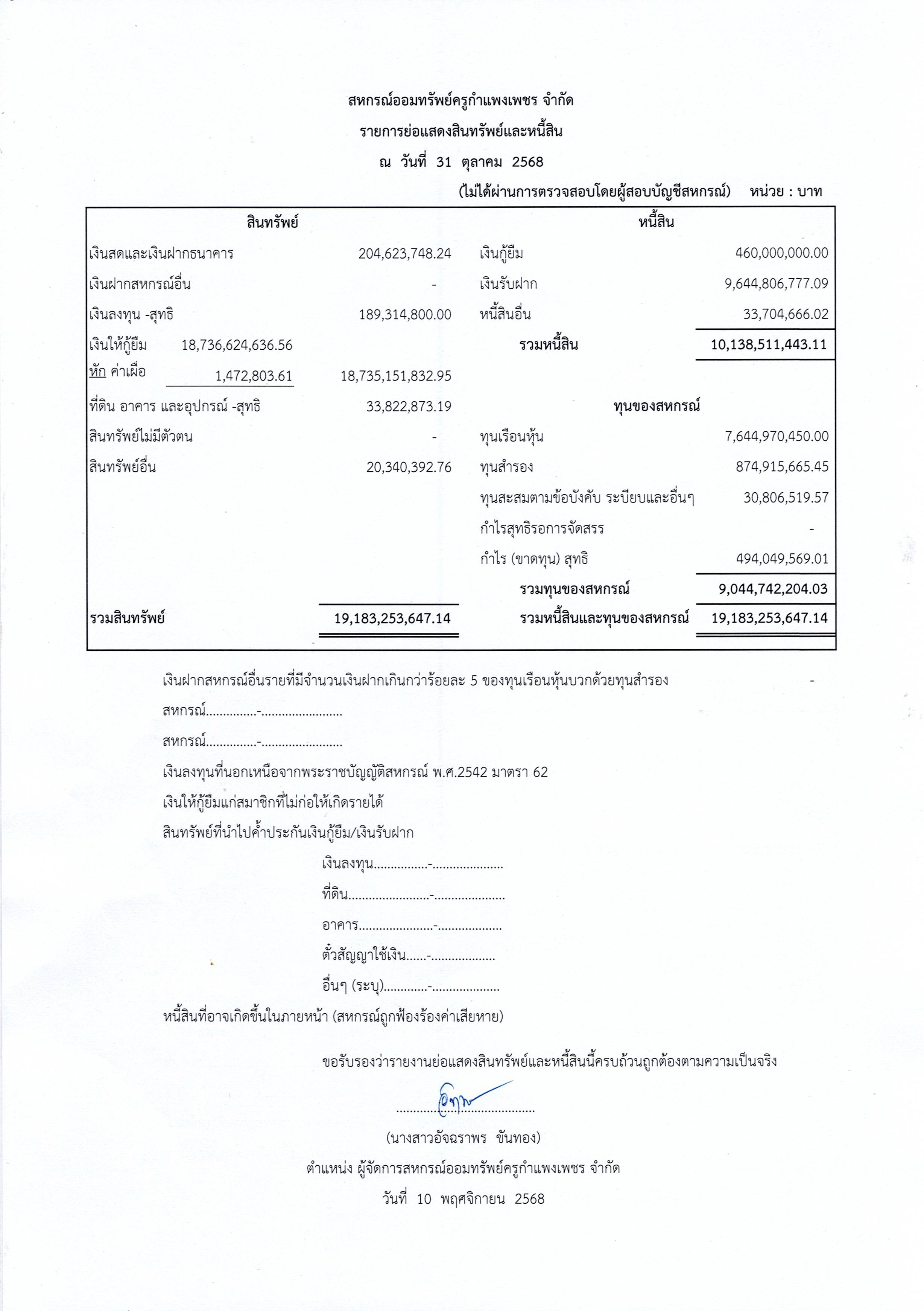รายการย่อแสดงสินทรัพย์และหนี้สิน ณ วันที่ 31 ตุลาคม 2568