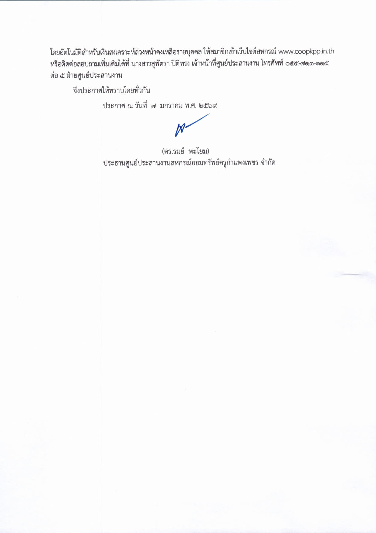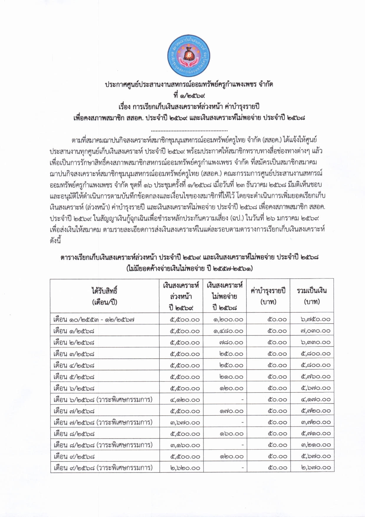 ประกาศ การเรียกเก็บเงินสงเคราะห์ล่วงหน้าและค่าบำรุงรายปี ประจำปี 2569 สส.อค.