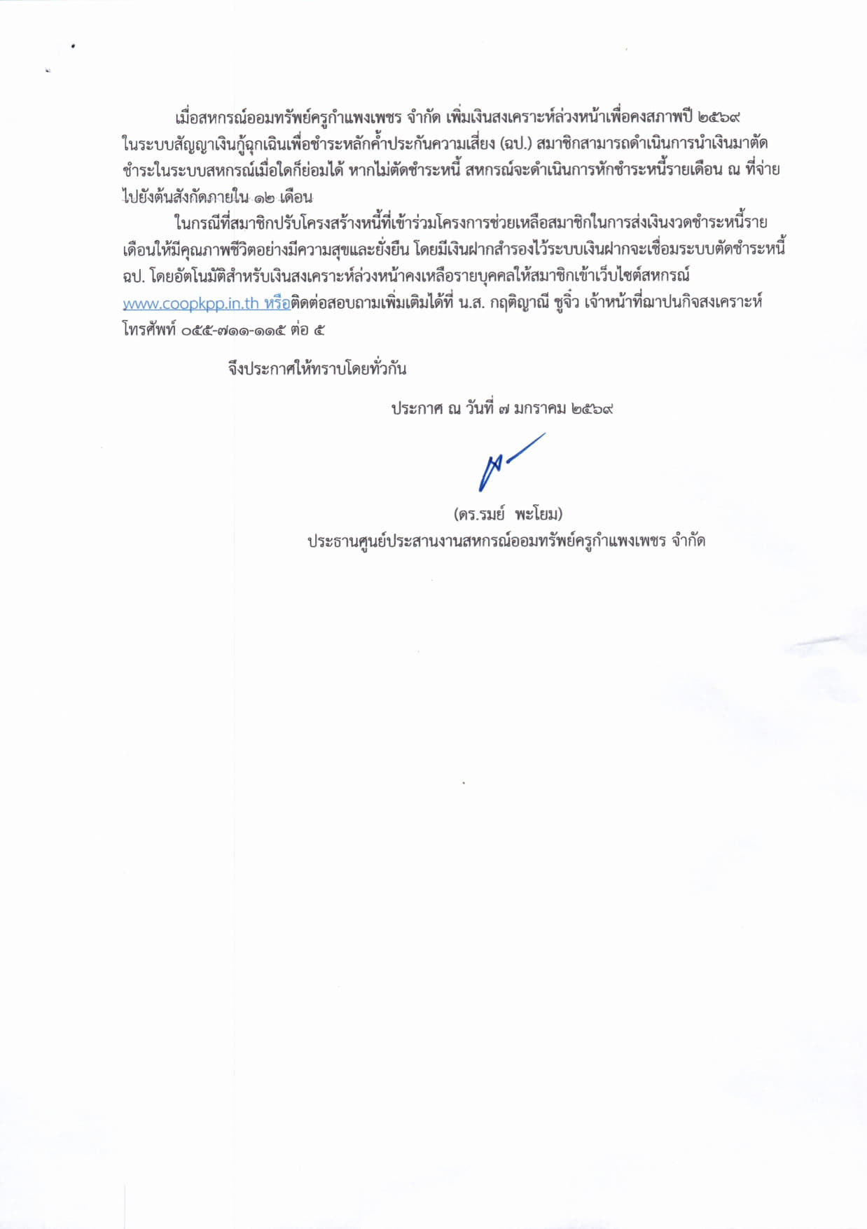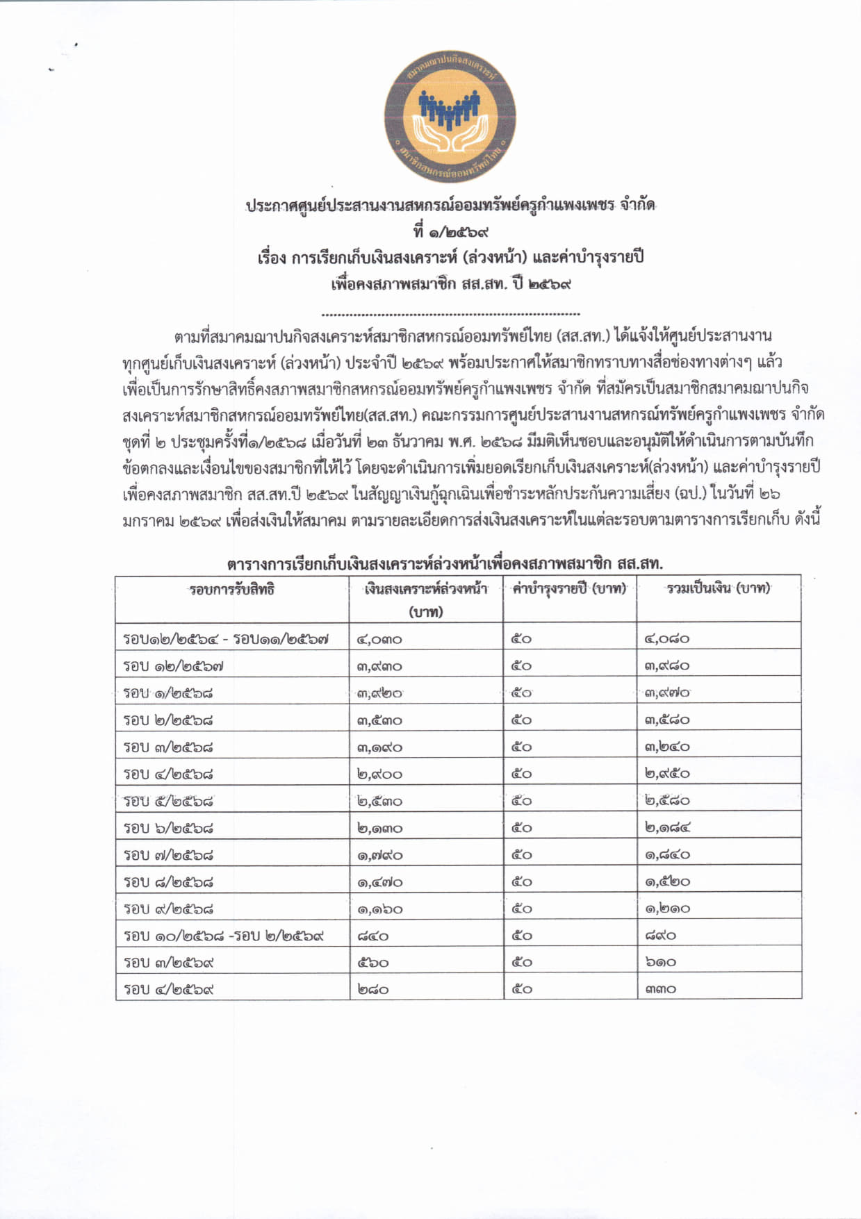 ประกาศ การเรียกเก็บเงินสงเคราะห์ล่วงหน้าและค่าบำรุงรายปี ประจำปี 2569 สส.สท.