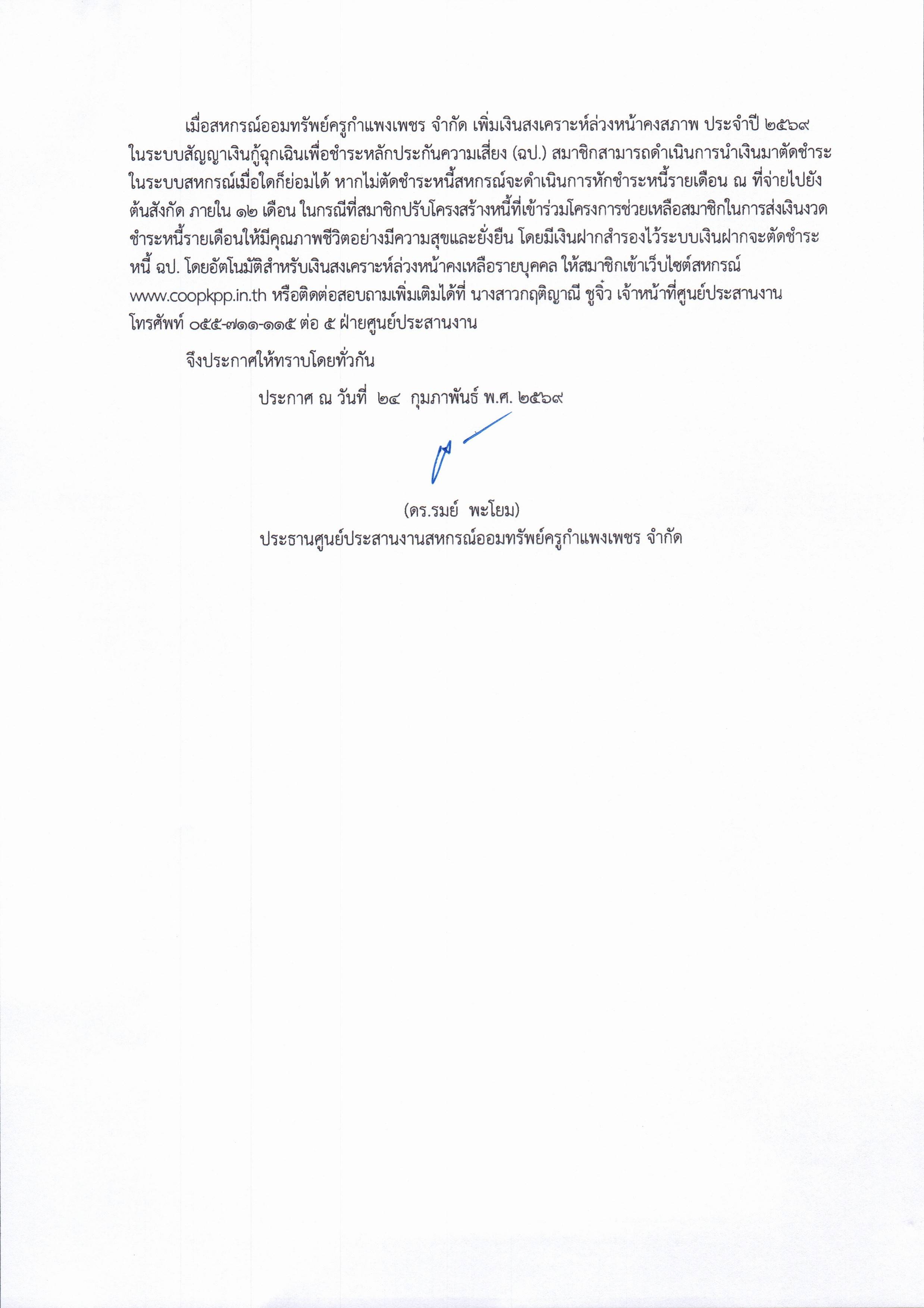 ประกาศ การเรียกเก็บเงินสงเคราะห์ล่วงหน้าและค่าบำรุงรายปี ประจำปี 2569 (สส.สก.)