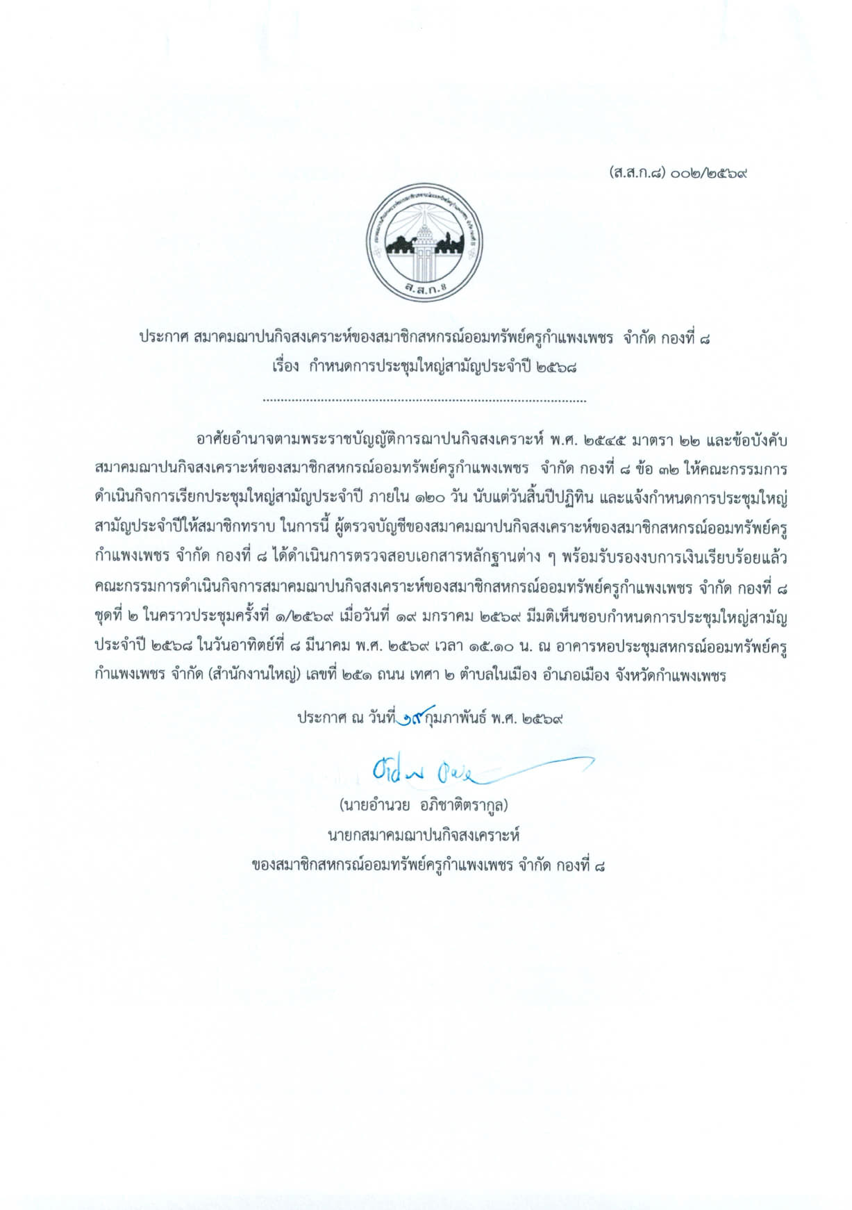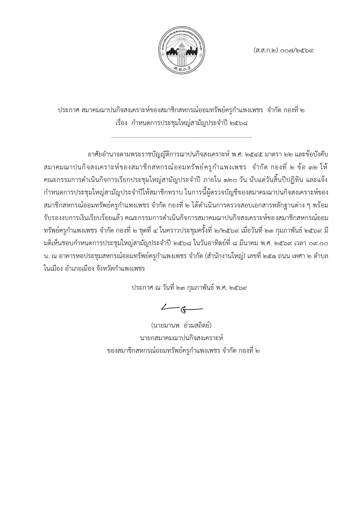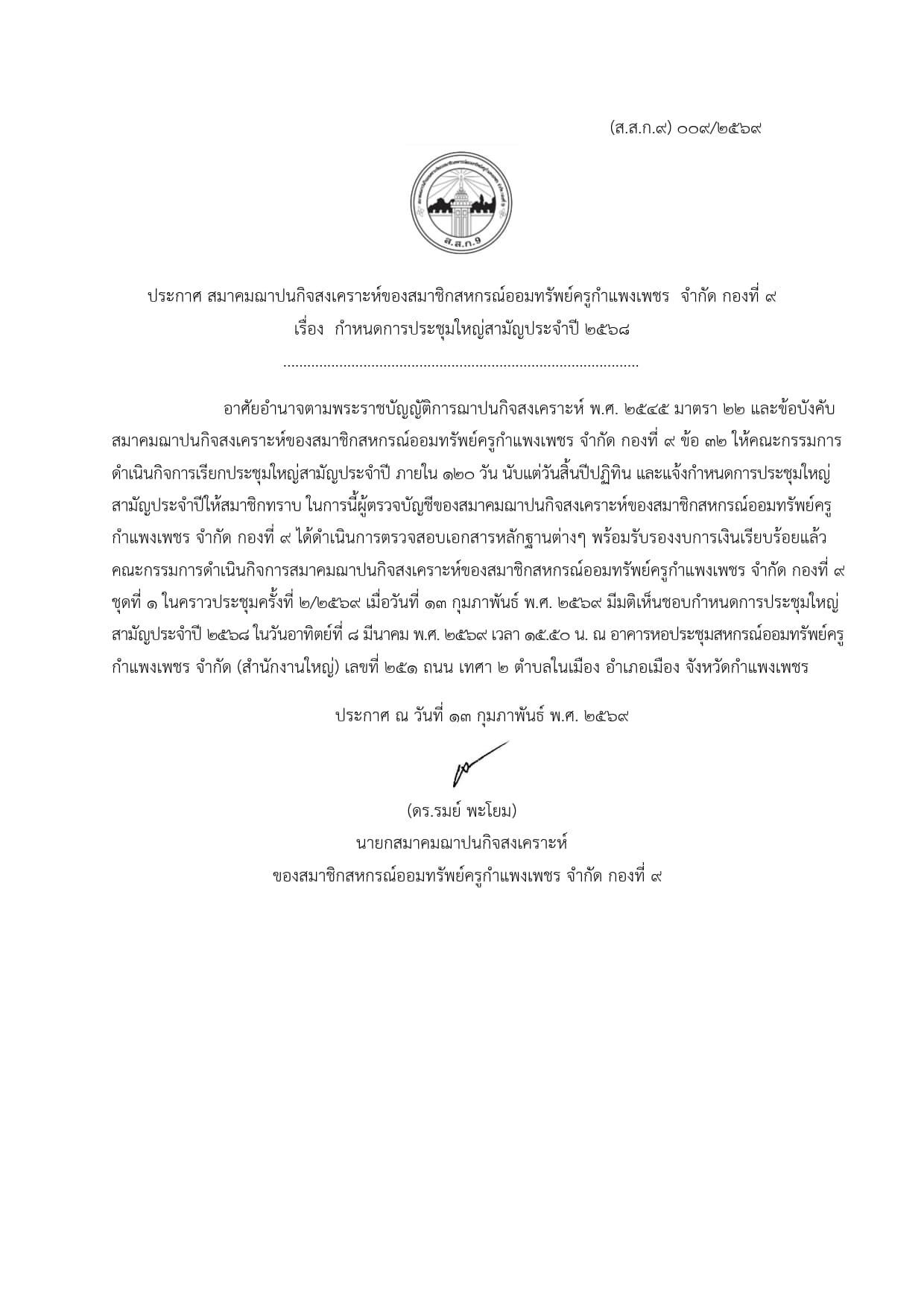 ประกาศ กำหนดวันประชุมใหญ๋สามัญประจำปี 2568 (ส.ส.ก.1-9)