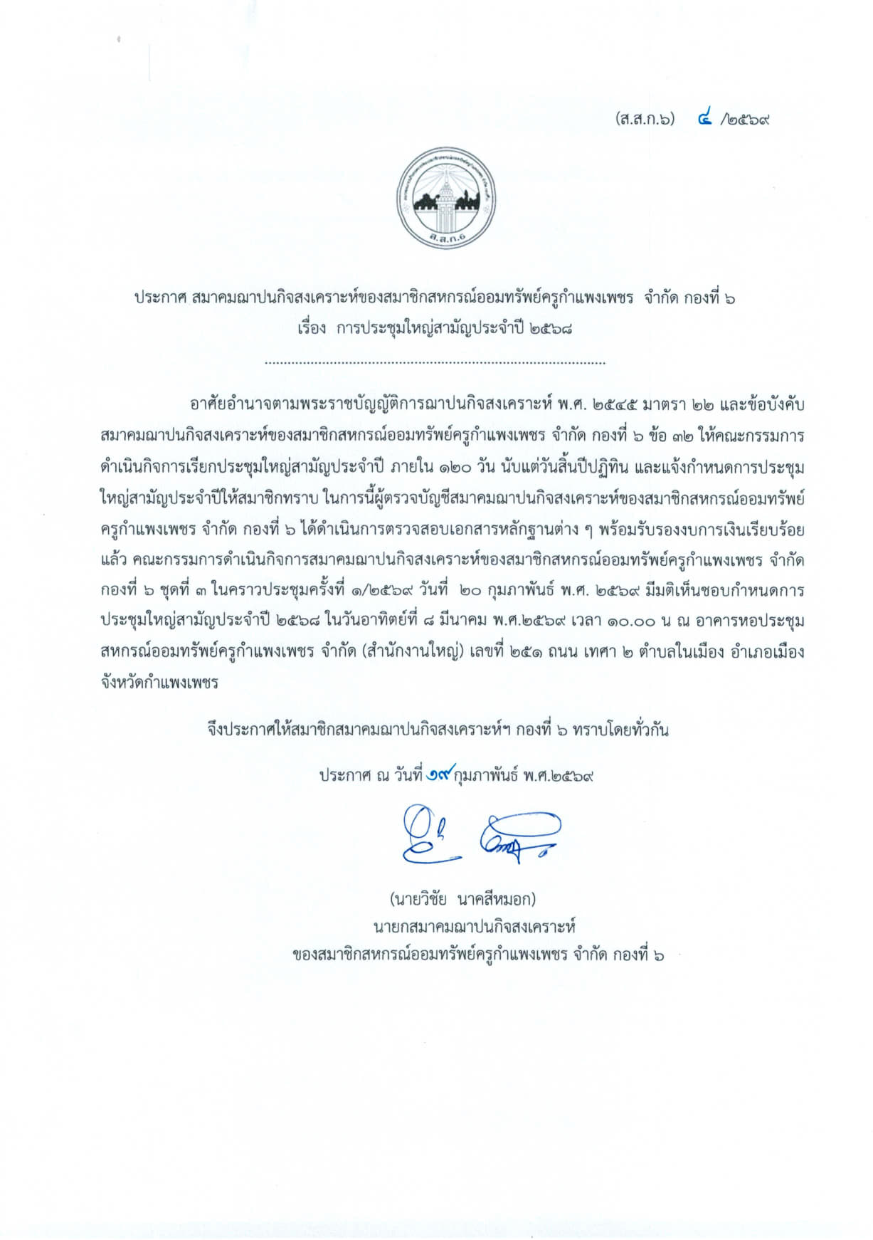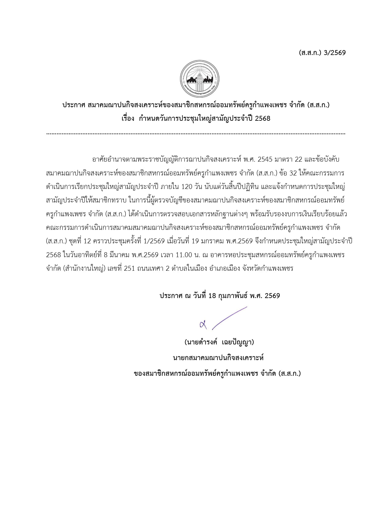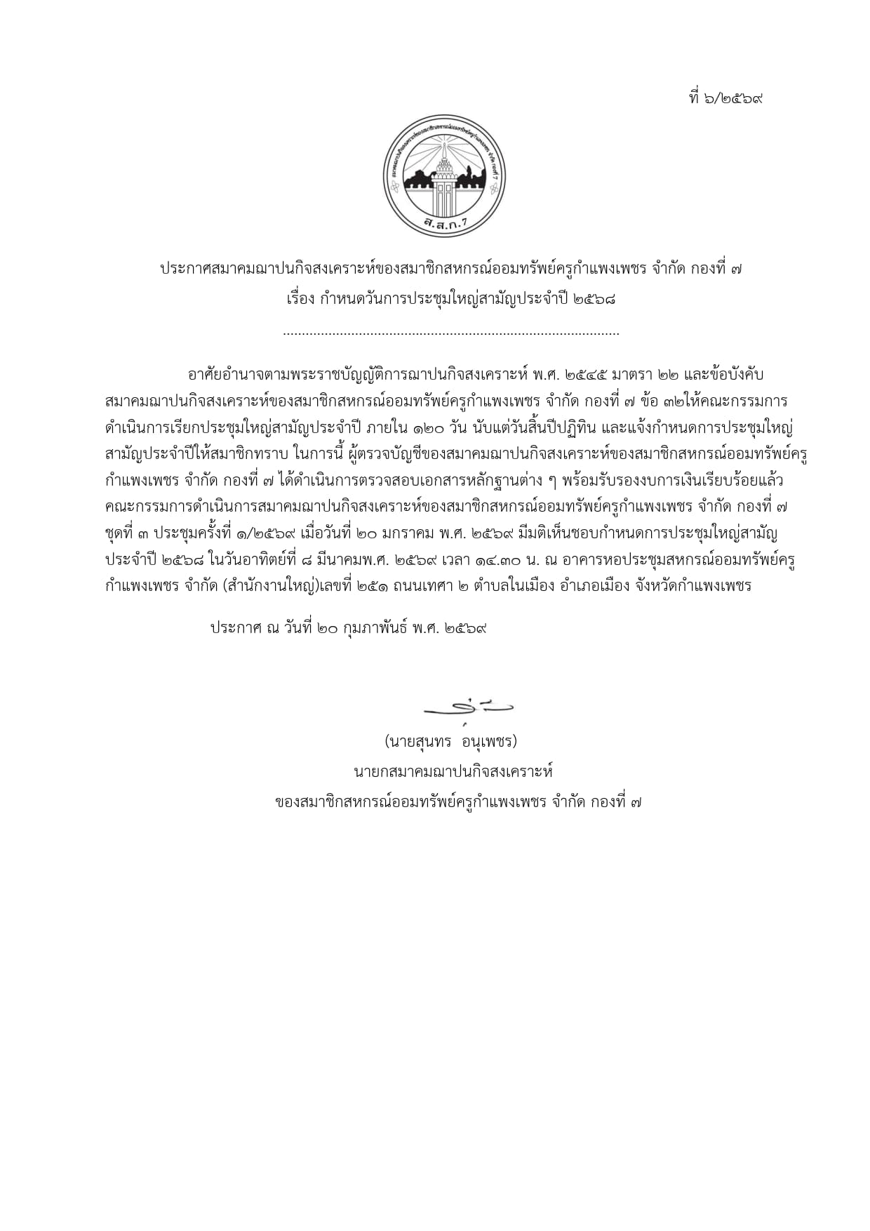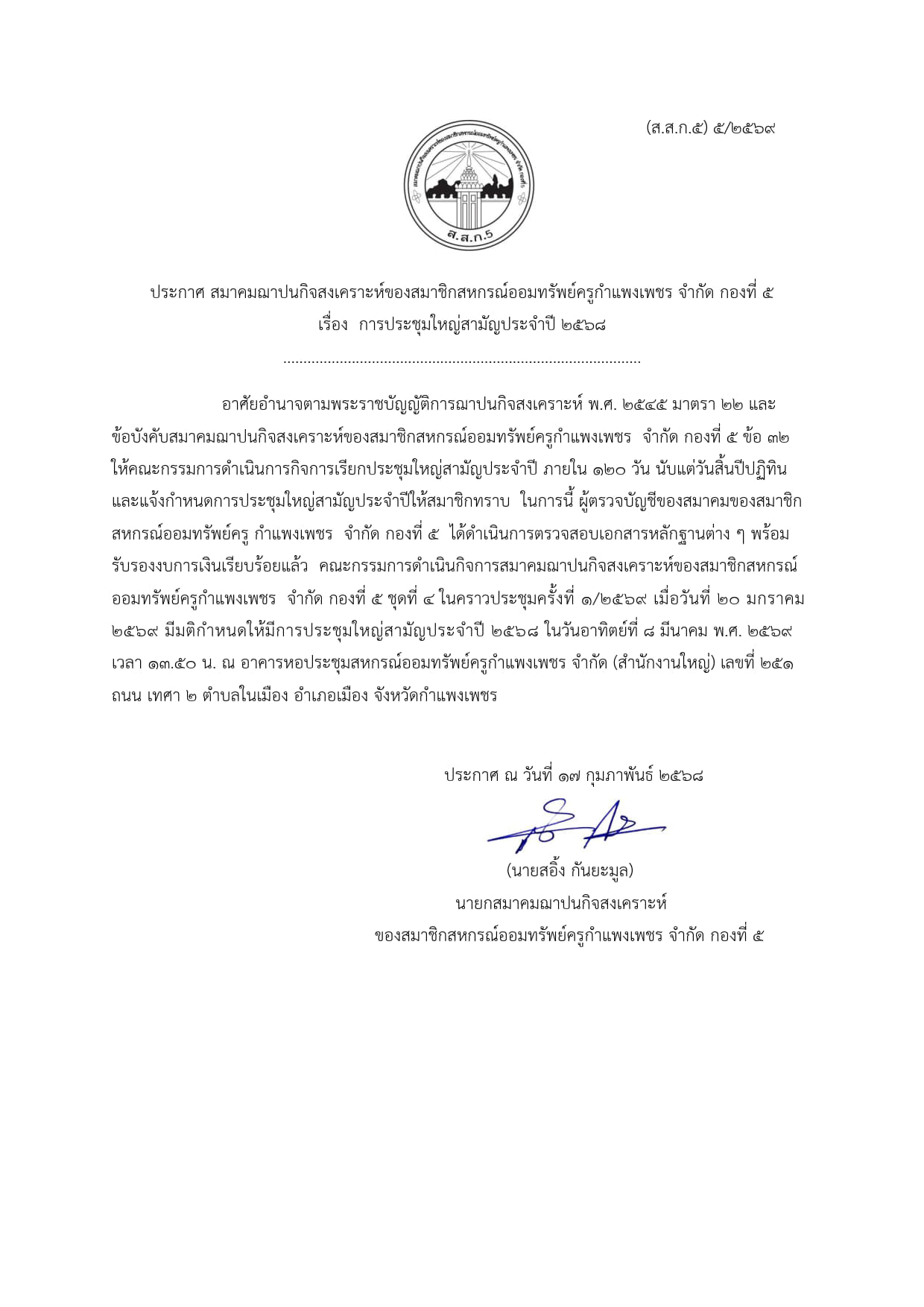 ประกาศ กำหนดวันประชุมใหญ๋สามัญประจำปี 2568 (ส.ส.ก.1-9)
